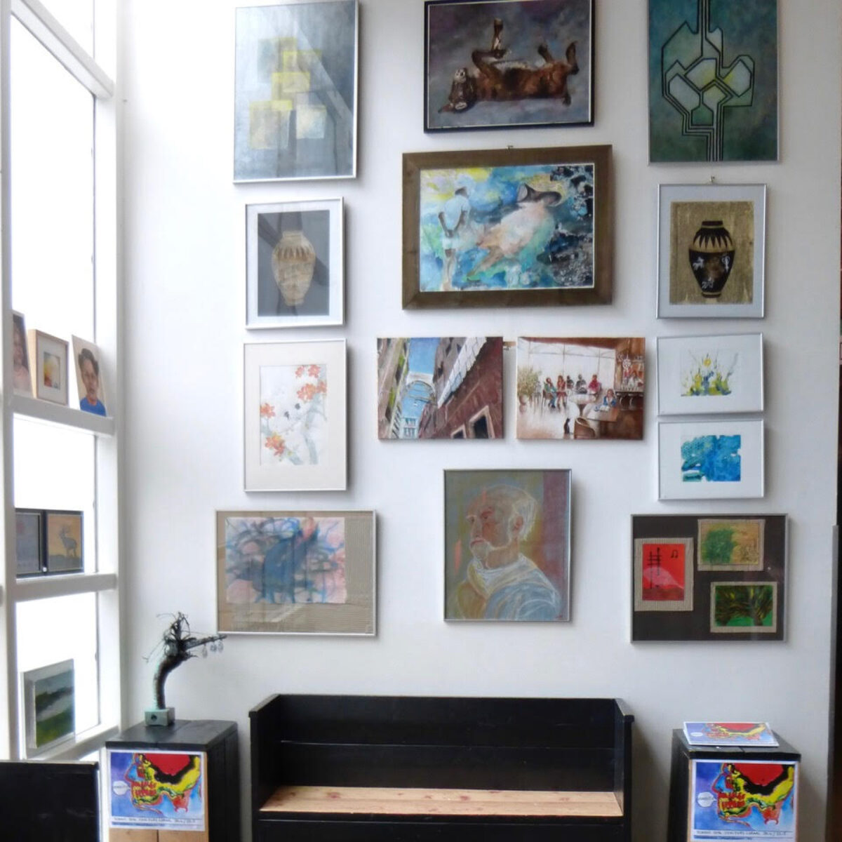 Tafels, krukken, ezels en schotten zijn aanwezig in twee fijne werkruimtes met goed licht. Werk “in wording” kan daar blijven staan.